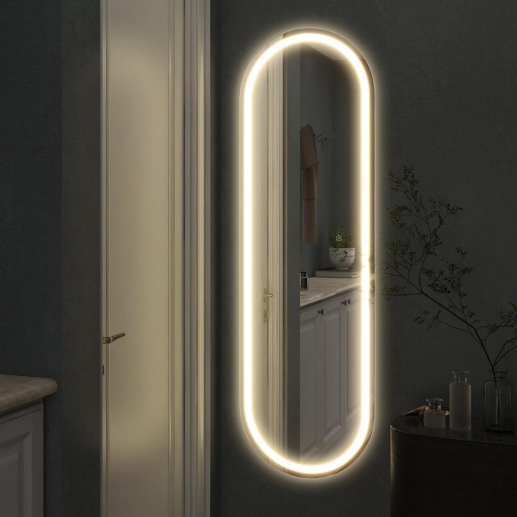 This wall mount LED full length mirror comes with a touch button that allows you to switch between different lighting options, including warm, cool and natural light. The brightness of the mirror can also be adjusted to suit your preference. Measuring 63″ x 20″, this mirror provides a full length view of your outfit. It is built to last with a sturdy frame and shatterproof glass, making it a long-lasting addition to your space!